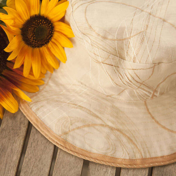 Silberfäden überschweben beerntete Feldern, Tau perlt in den morgendlichen Wiesen - Zeit sich für den Abgang des Sommers zu rüsten: Ob mit Sommerblumen im Garten oder mit Aperolspritz auf der Piazza - dieser freche Hut sorgt dafür, dass der 'Indian Summer' nicht zum 'Altweibersommer' wird. Keckes Lederband umschlingt beschwingtes Leinen.